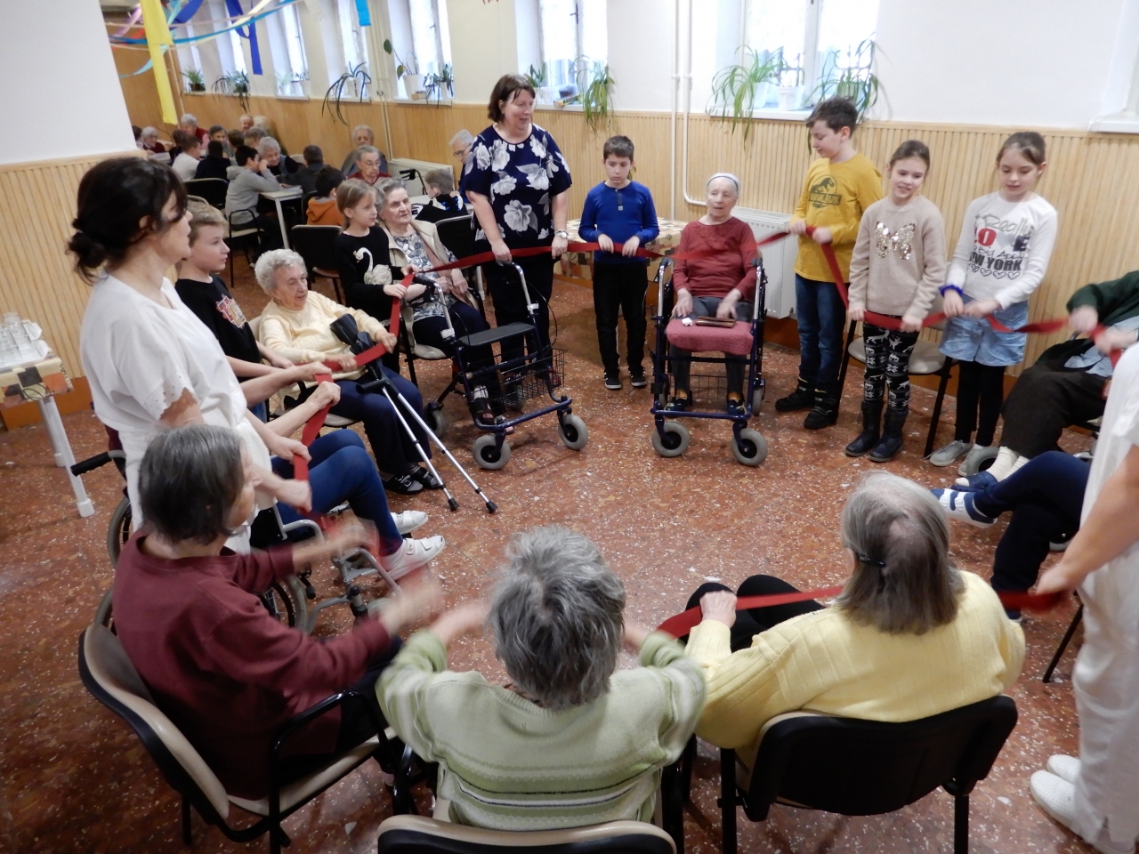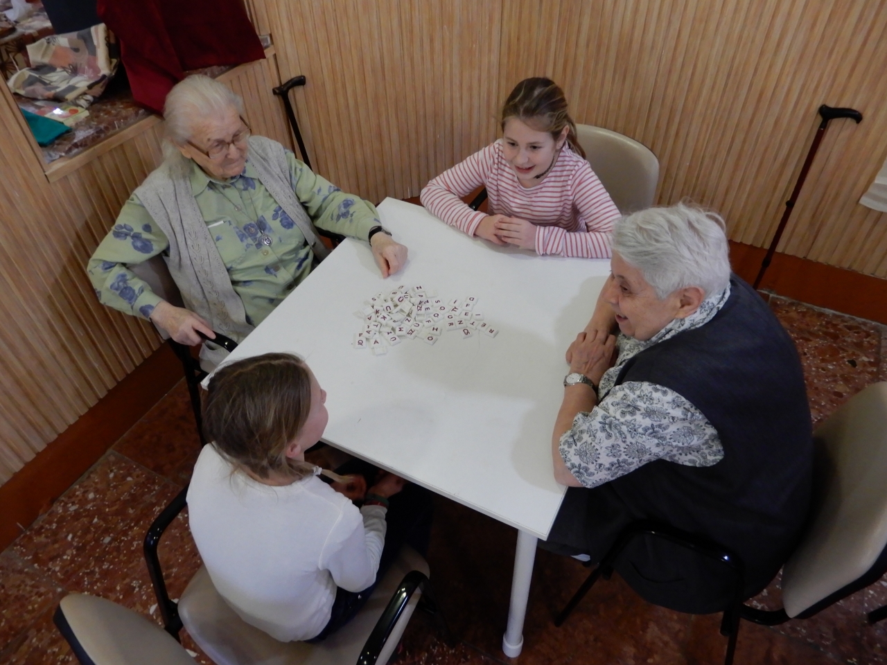 A mai kiscsoportos foglalkozás kibővült a Szent Erzsébet Katolikus Általános Iskola 5. osztályos tanulóival. A két korosztály nagyon jól összehangolódott, felszabadultan énekeltek, társasjátékoztak egymással. Különösen nagy sikere volt a labdázásnak, megható volt, ahogyan figyeltek a gyerekek az idősekre. Figyelembe vették képességeiket, nagyon igyekeztek jól dobni a labdát. Kellemes beszélgető csoportok is kialakultak, valószínűleg barátságok fognak kialakulni, mert havi egy alkalommal, minden hónap utolsó keddjét fogjuk együtt tölteni.