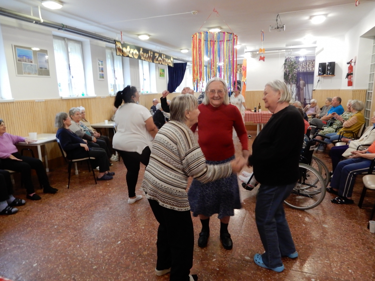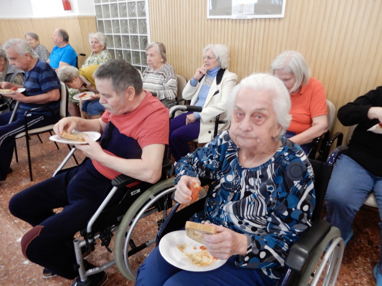 Ezen az esős és hűvös délutánon az alagsori ebédlőben tartottuk meg a majálist, azonban a rossz időjárás sem tudta elrontani a lakóink és munkatársaink jó hangulatát. Maderspach Zoltán - mint mindig – most is csuda jókedvre derített bennünket zenéjével, énekével és a személyiségéből áradó derűjével.