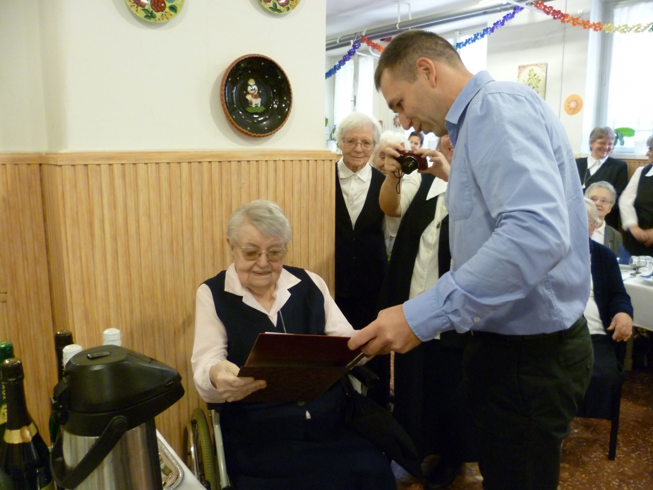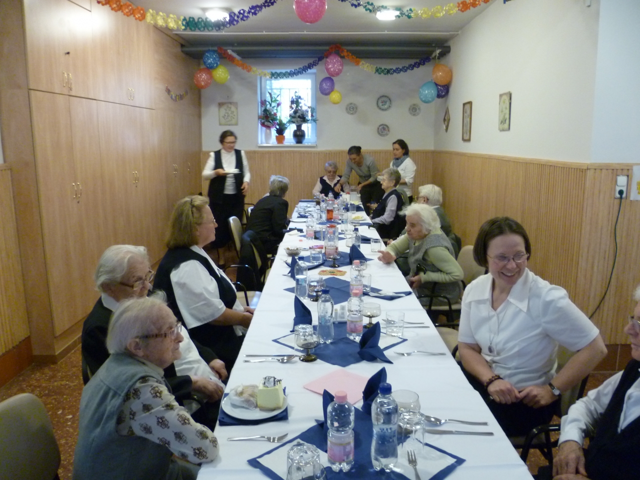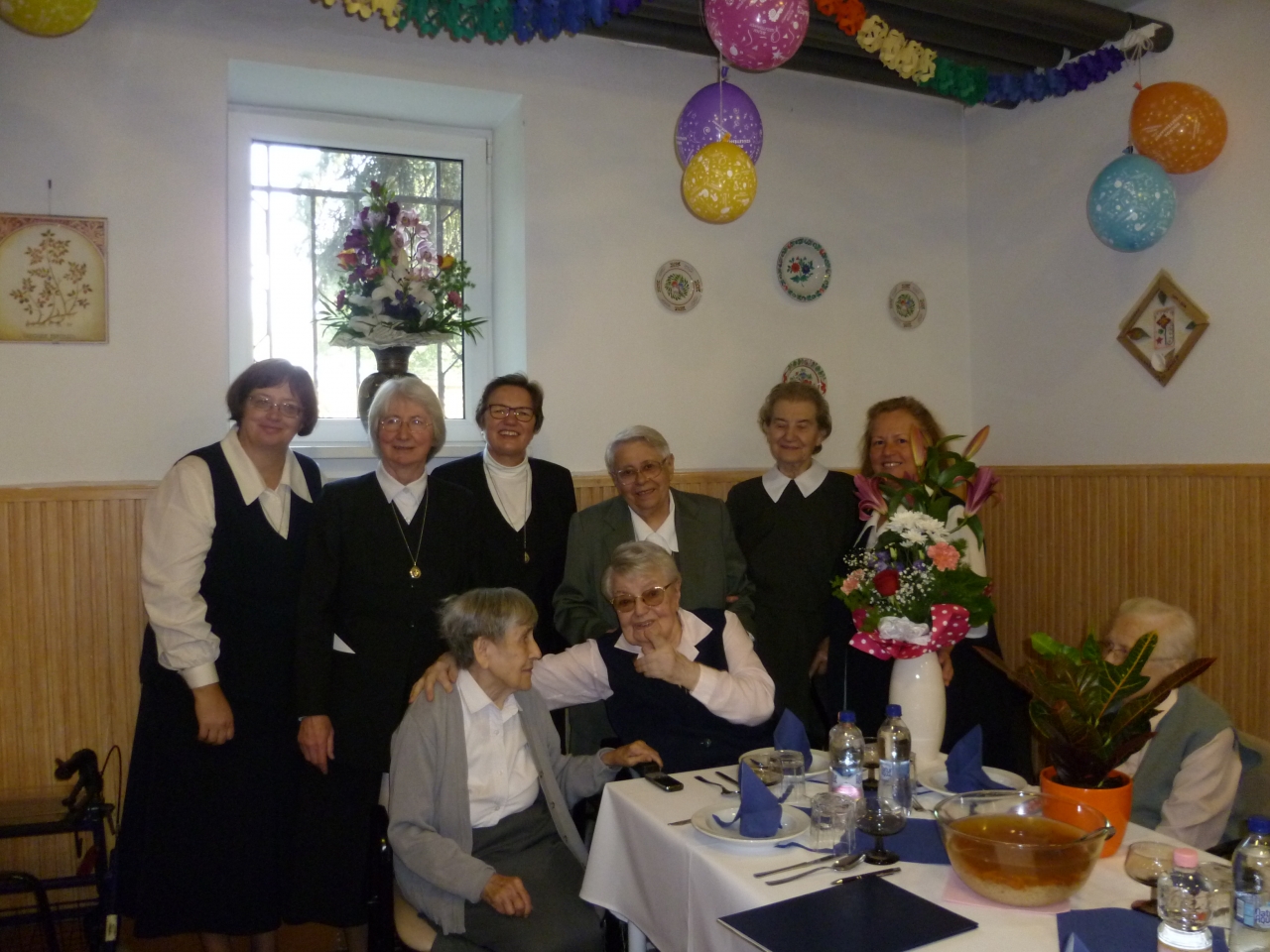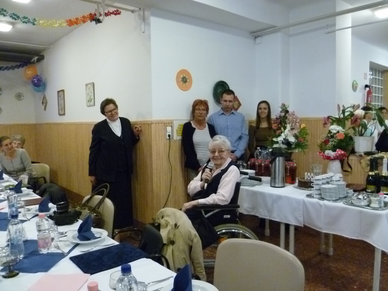 Századik születésnapját ünnepeltük Gerencsér Katalin Testvérnek. Erre a jeles alkalomra a Társaság sok tagja eljött, hogy együtt örüljön Kata testvérrel. Jókívánságaikat Suller Melinda általános elöljáró tolmácsolta. Pécel Város Önkormányzatának képviseletében Fazekas Barna alpolgármester egy kedves verssel, tortával, oklevéllel, virágcsokorral köszöntötte az Ünnepeltet. Nagyné Valika munkatársunk és Gergely Katalin testvér szintén egy-egy ünnepi hangulatú verset választott. A Szent Erzsébet Katolikus Általános Iskola tanulói Varga Krisztina zenepedagógus vezetésével magas színvonalú, hangszeres kísérettel előadott énekekkel ajándékozták meg az ünnepeltett, vendégeinket, és lakóinkat. A műsor közben Kata testvér is szót kért, hogy megossza velünk örömét, és az Úr iránt érzett háláját. Az ezt követő ünnepi ebéd bensőséges, igazi családias hangulatú volt.