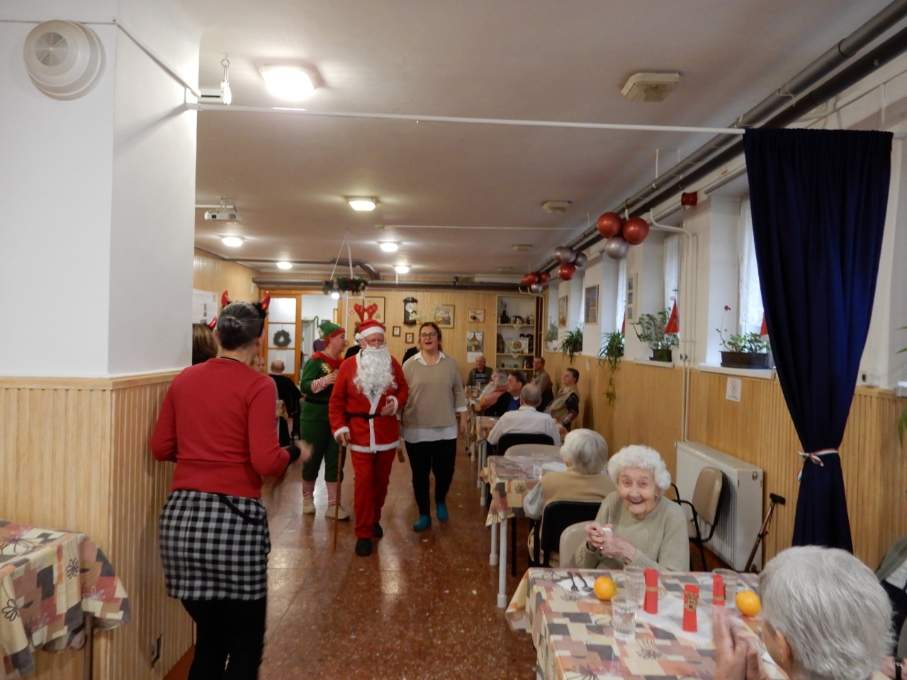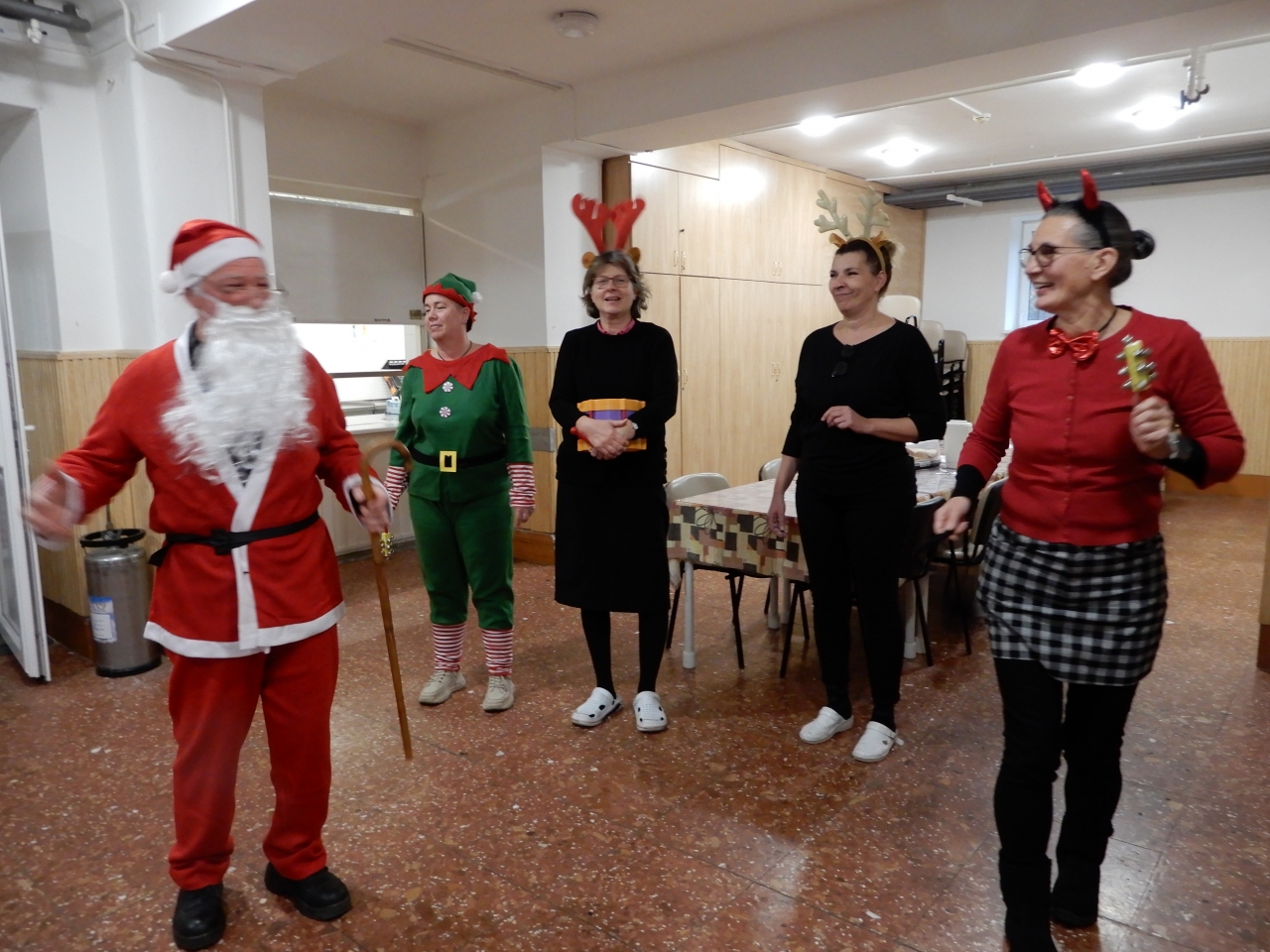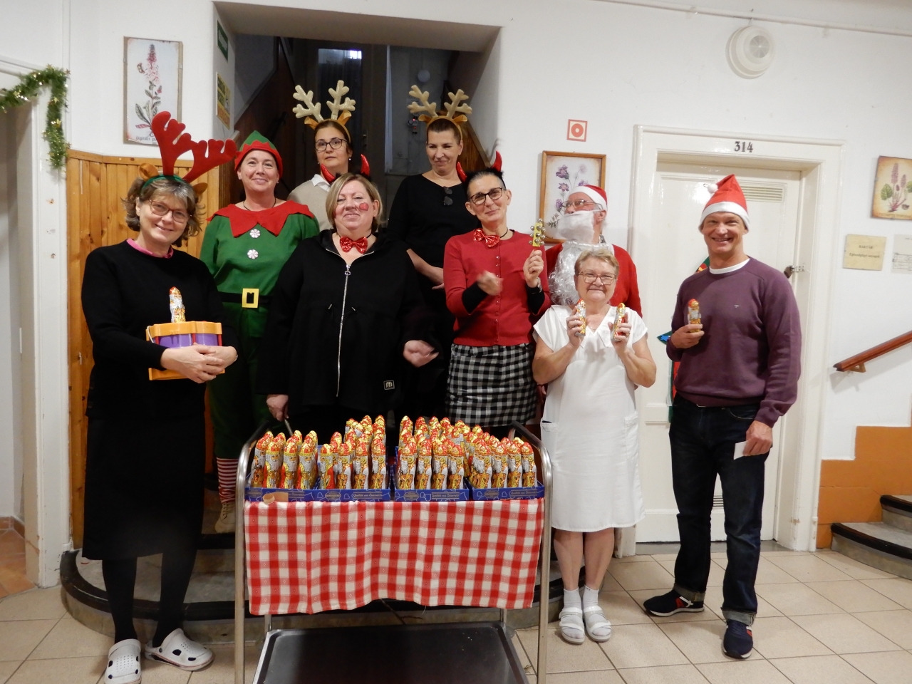 Igazi karácsonyi varázs költözött intézményünk falai közé, amikor hétvégén maga a Mikulás látogatott el hozzánk! A különleges vendég nem egyedül érkezett: vele tartottak krampuszai, mókás rénszarvasai és még egyik vidám manója is – mindannyian a dolgozóink kreatív jelmezeiben.