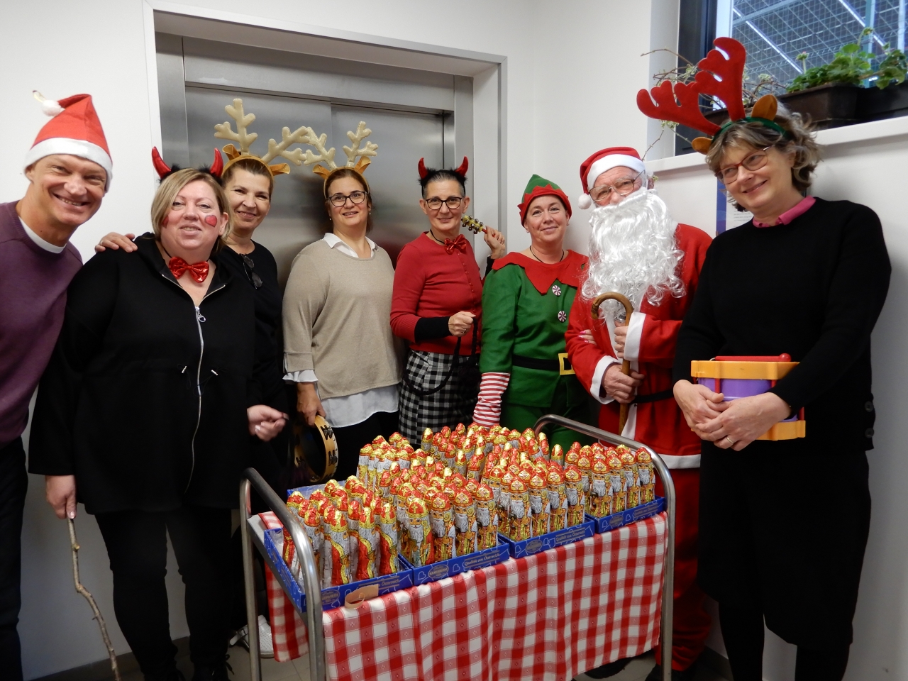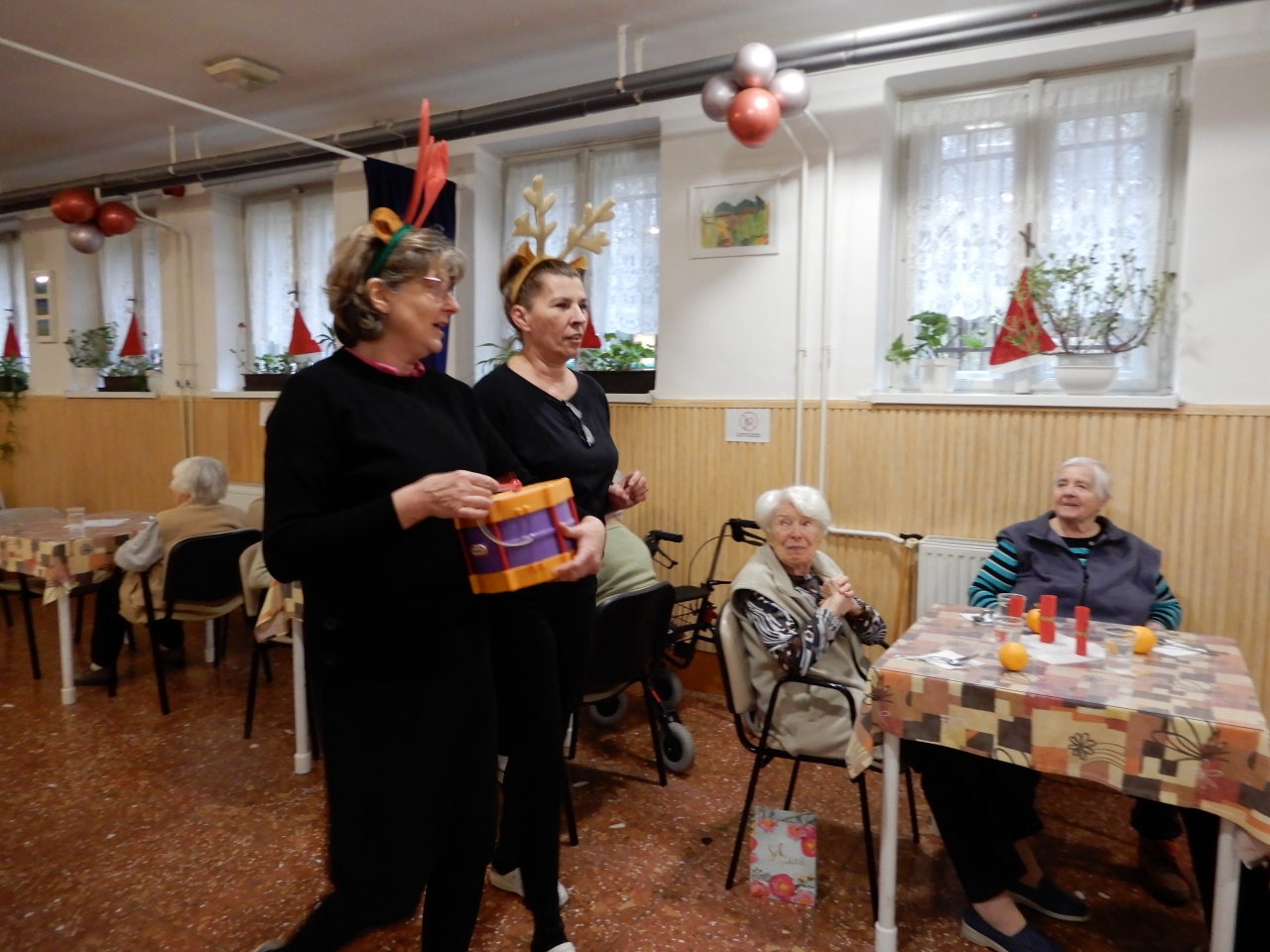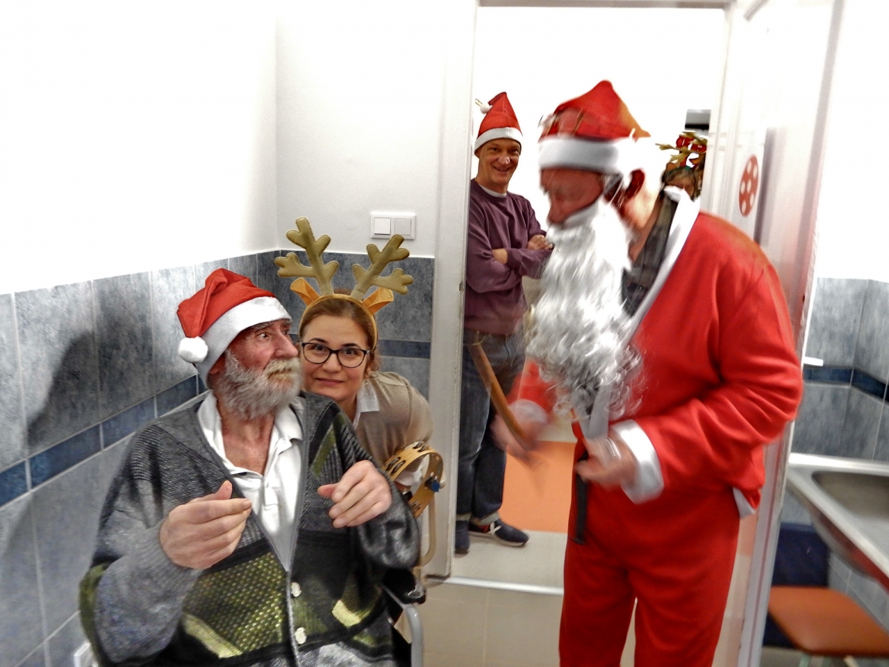 Igazi karácsonyi varázs költözött intézményünk falai közé, amikor hétvégén maga a Mikulás látogatott el hozzánk! A különleges vendég nem egyedül érkezett: vele tartottak krampuszai, mókás rénszarvasai és még egyik vidám manója is – mindannyian a dolgozóink kreatív jelmezeiben.