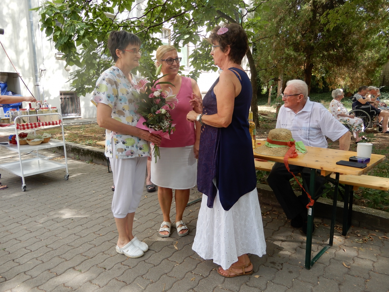 Ez a nap azért is különleges volt, mert Fóti Emőke, a mentálhigiénés csoport vezetője augusztus közepétől nyugdíjas lesz. Már a Nagyboldogasszony napján tartott ünnepi misén is hálát adtuk az Ő sokéves odaadó munkájáért, de a köszöntés, a búcsúzást itt is folytatódott. Munkatársainktól kedves ajándékokat, csokrokat kapott Emőke. Szerencsére támogatására, segítő jelenétére a továbbiakban is számíthatunk.
