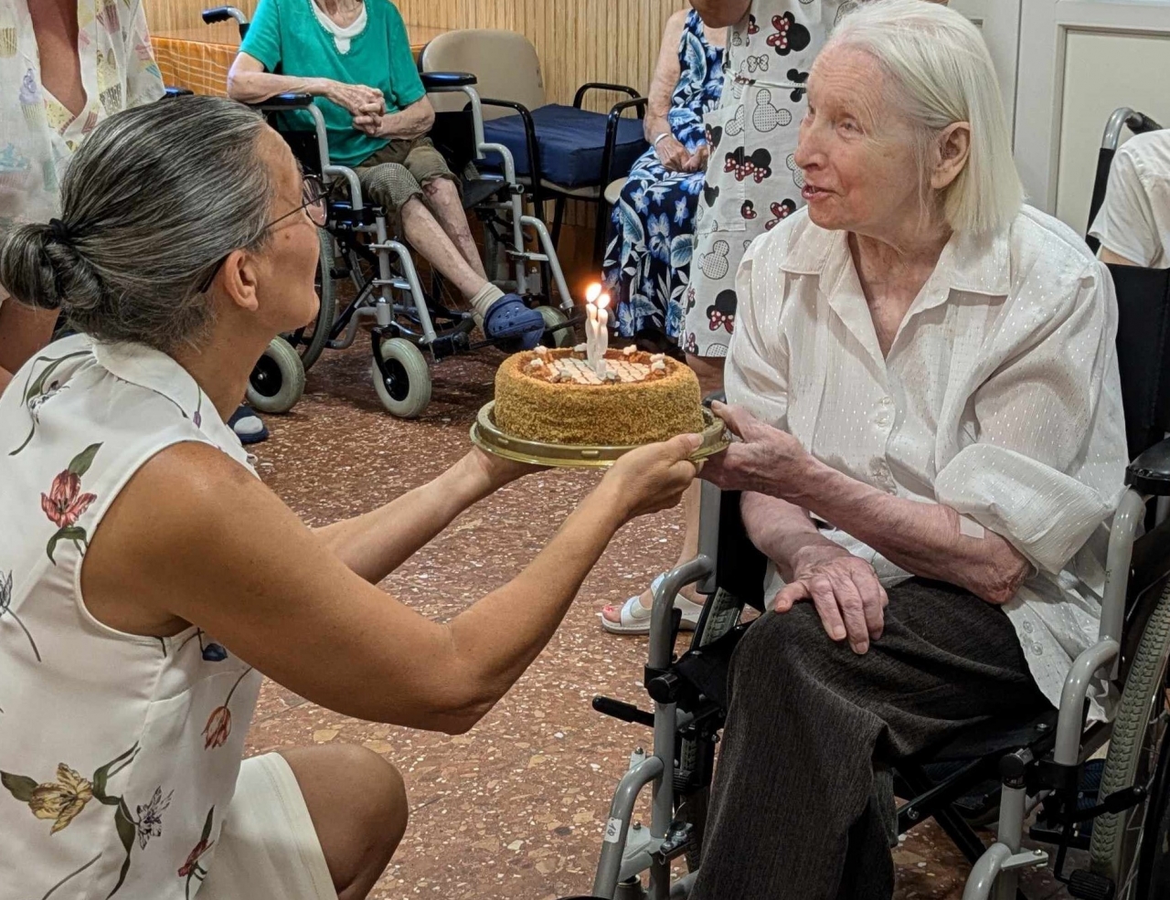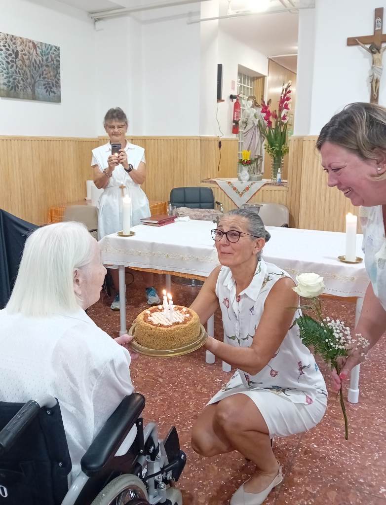A reggeli igeliturgián megemlékeztünk Elvira testvérről, aki a mai napon ünnepli 93. születésnapját. Az igeliturgia végén lakóinkkal közösen köszöntöttük elénekelve az Ároni áldást. A nálunk lakó testvéreket mindig egy szál virággal köszöntjük, és ugyan Elli testvér nem kerek évfordulót ünnepelt, mégis kapott tortát, mert kilencven év fölött minden születésnap egy ajándék. A köszöntést nagy örömmel fogadta, a tortát pedig ebéd után rendtársaival és közvetlen lakótársaival osztotta meg.